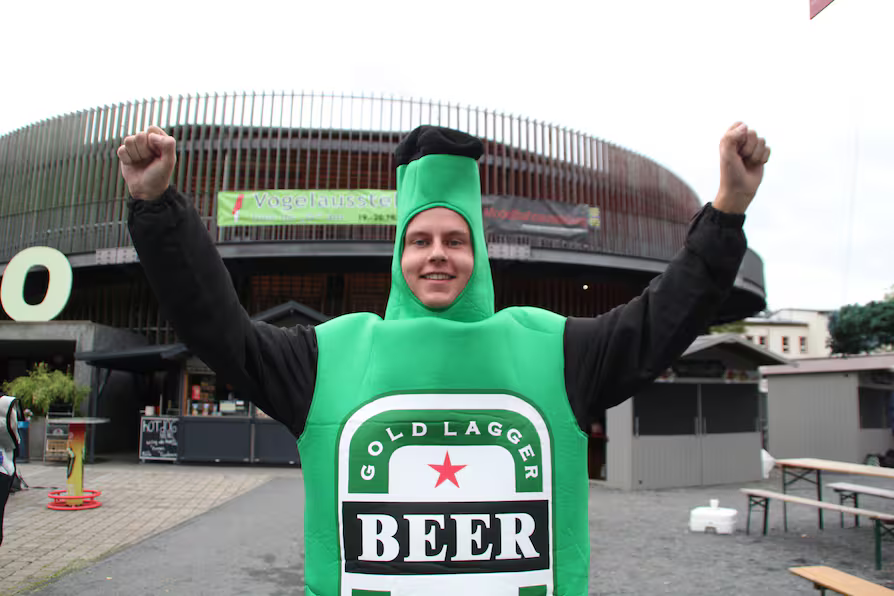 Beim Sponsorenlauf des Thomas-Mann-Gymnasiums waren am Donnerstag im O-Schatz-Park 620 Teilnehmer dabei – darunter auch Haie, Bierflaschen und Hühner. Das ist der Hintergrund für die verrückten Kostüme.