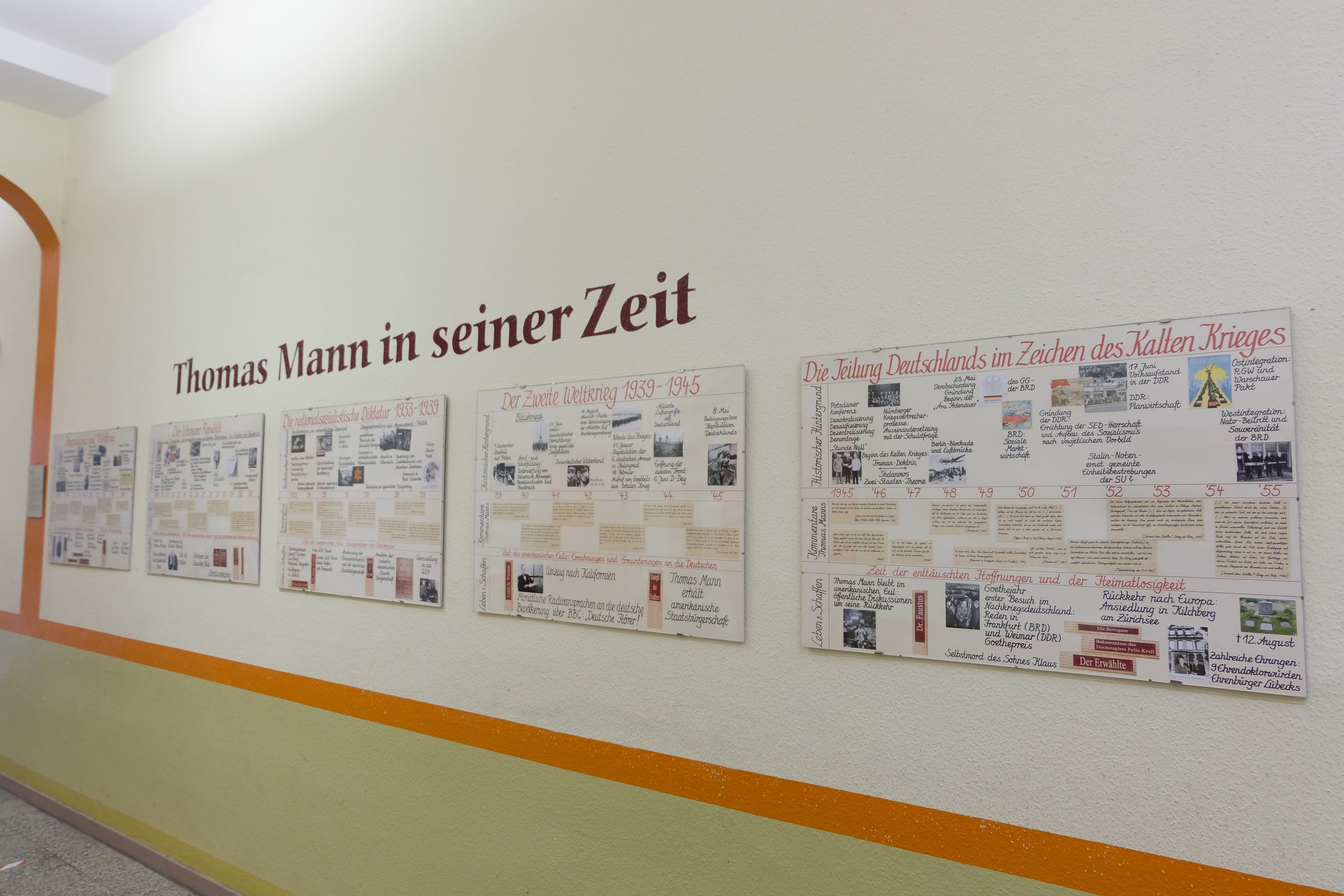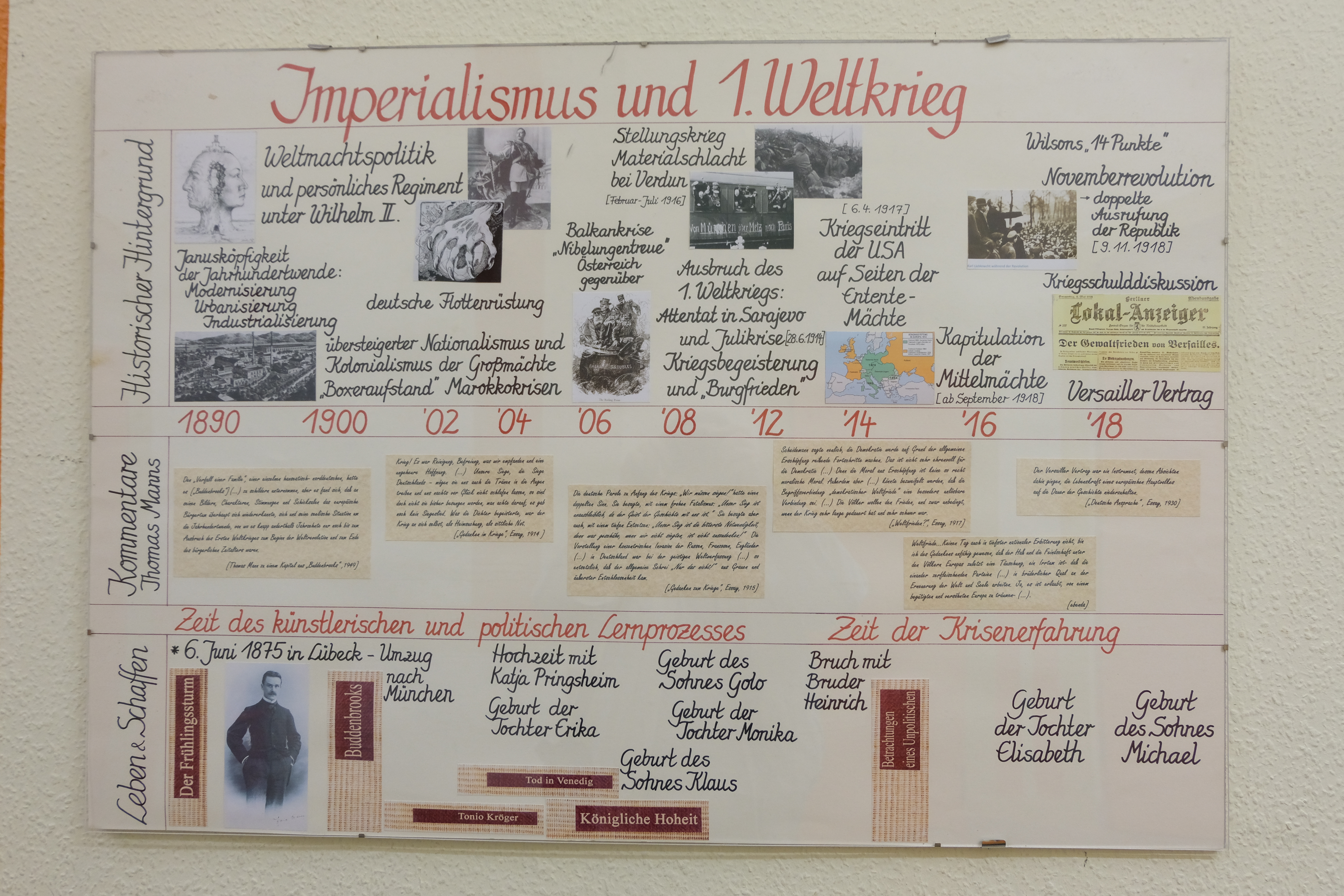 Im Erdgeschoss des Hintergebäudes hängt dieser Zeitstrahl über den berühmten Namensgeber unserer Schule - Thomas Mann. Er ist in einem fächerverbindenden Schülerprojekt der Fächer Geschichte und Deutsch entstanden. Um die kleinen Kommentare auf den Abbildungen zu lesen, ist es nötig, die Fotos in Originalgröße herunterzuladen. Dazu einfach den Download-Button download picture logo des entsprechenden Bildes klicken.