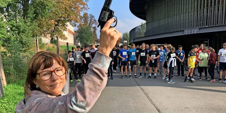 Schulleiterin Marion Müller gibt den Startschuss für die zweite Rundes des Sponsorenlaufes am Thomas-Mann-Gymnasium. Quelle: Hagen Rösner