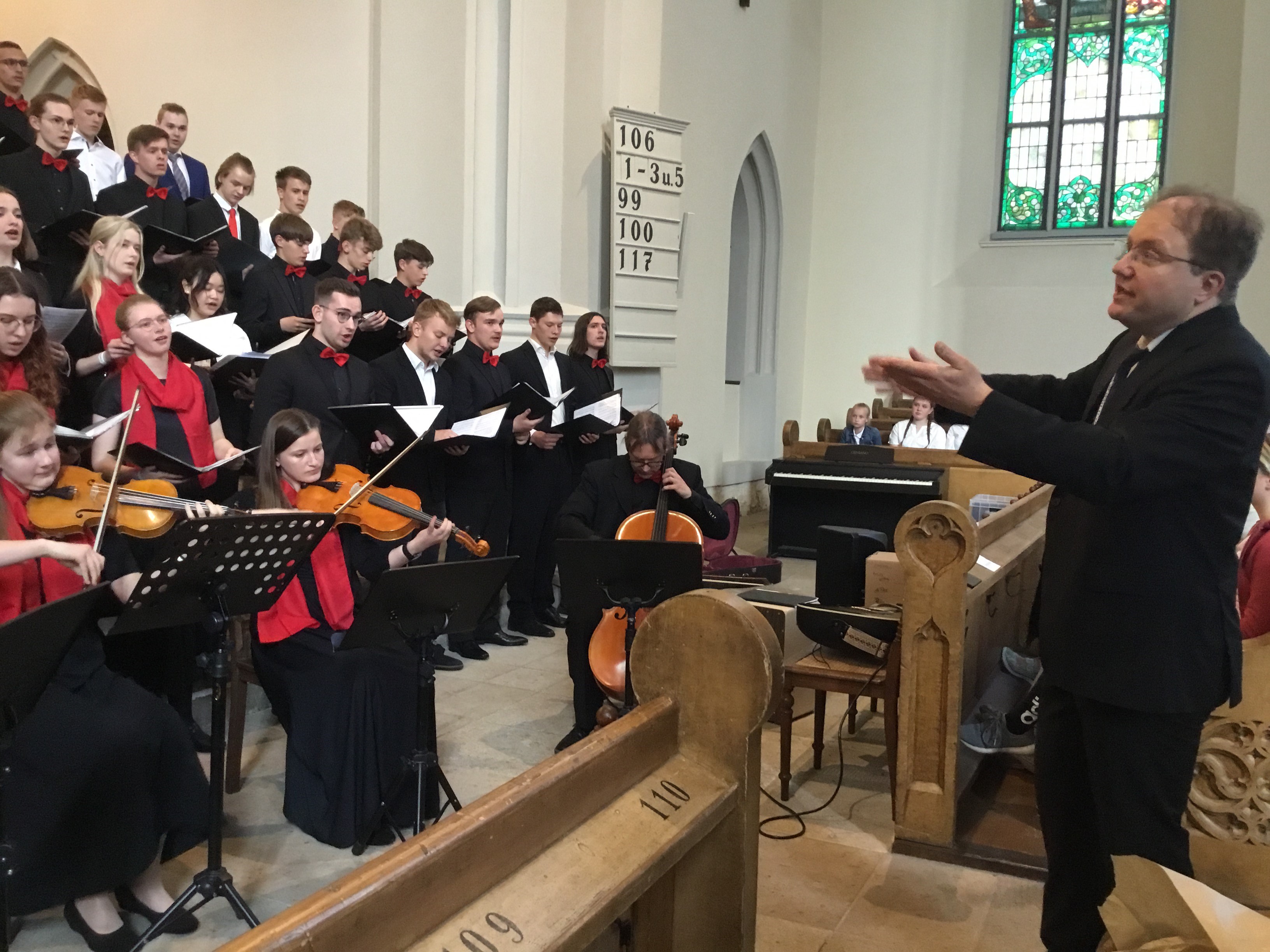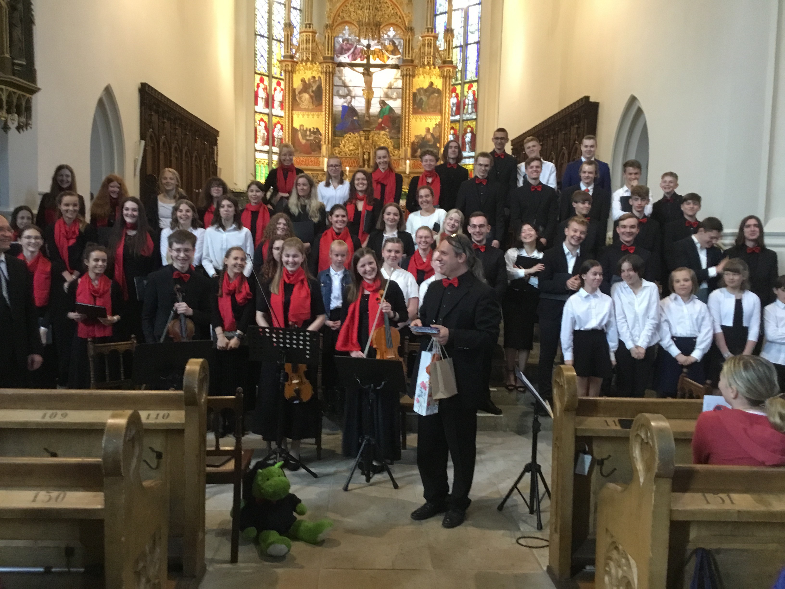 Herr Hartwiger, unser Chorleiter, hat im Finale des Konzertes zu dem Titel „Ave herum Corpus“ beide Chöre, unseren Jugendchor und einen für ihn bisher völlig fremden Chor, hervorragend geleitet und dirigiert.