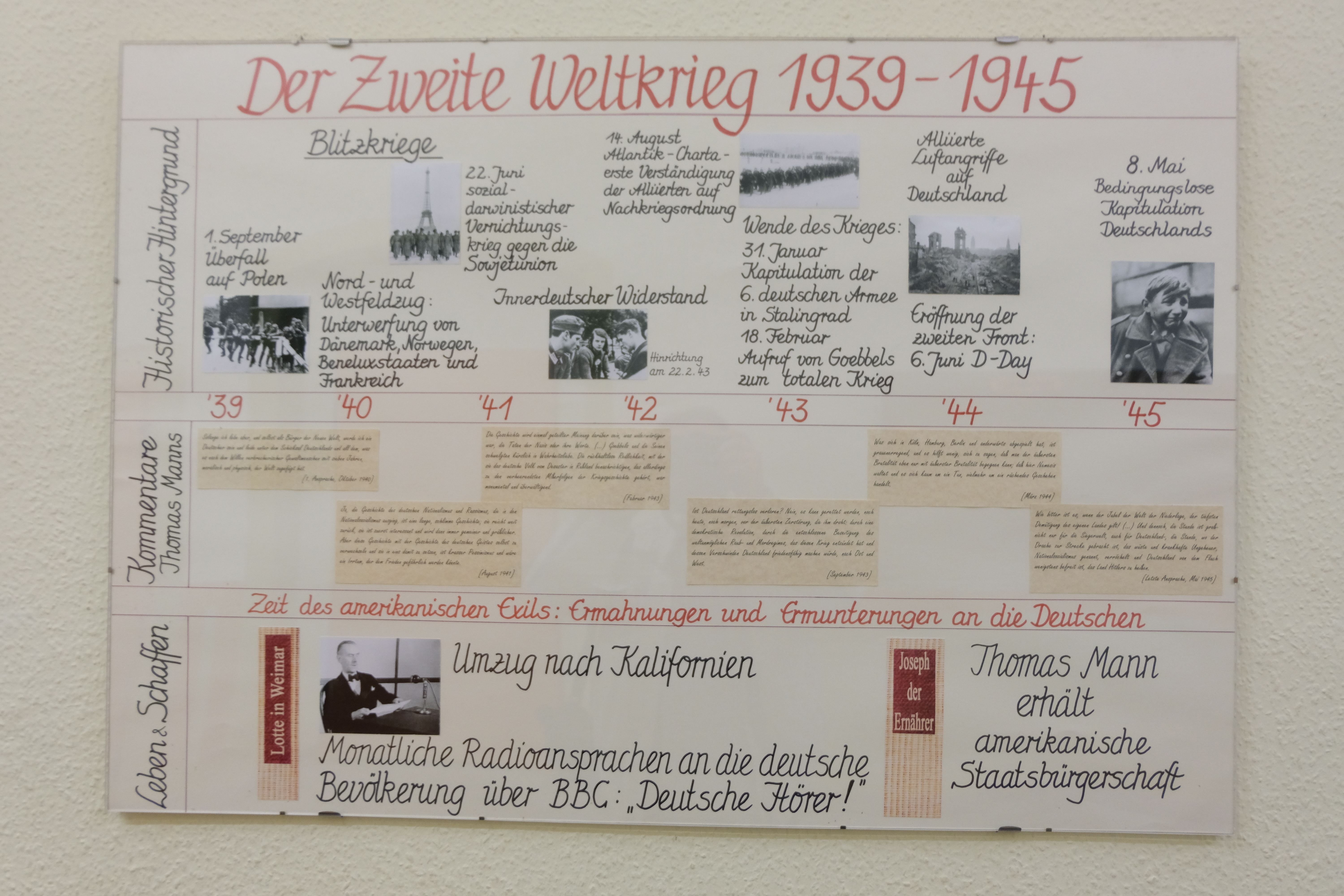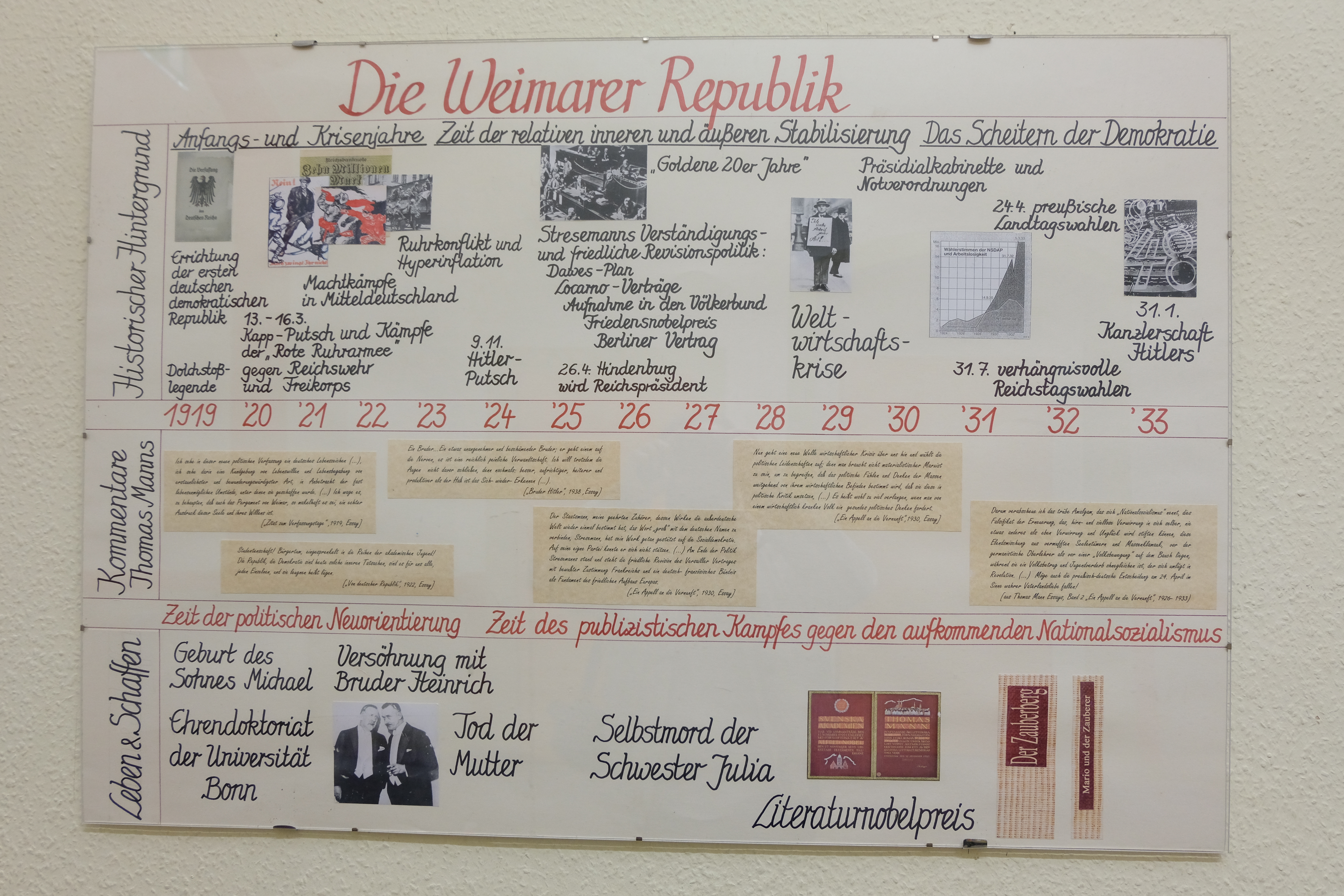 Im Erdgeschoss des Hintergebäudes hängt dieser Zeitstrahl über den berühmten Namensgeber unserer Schule - Thomas Mann. Er ist in einem fächerverbindenden Schülerprojekt der Fächer Geschichte und Deutsch entstanden. Um die kleinen Kommentare auf den Abbildungen zu lesen, ist es nötig, die Fotos in Originalgröße herunterzuladen. Dazu einfach den Download-Button download picture logo des entsprechenden Bildes klicken.
