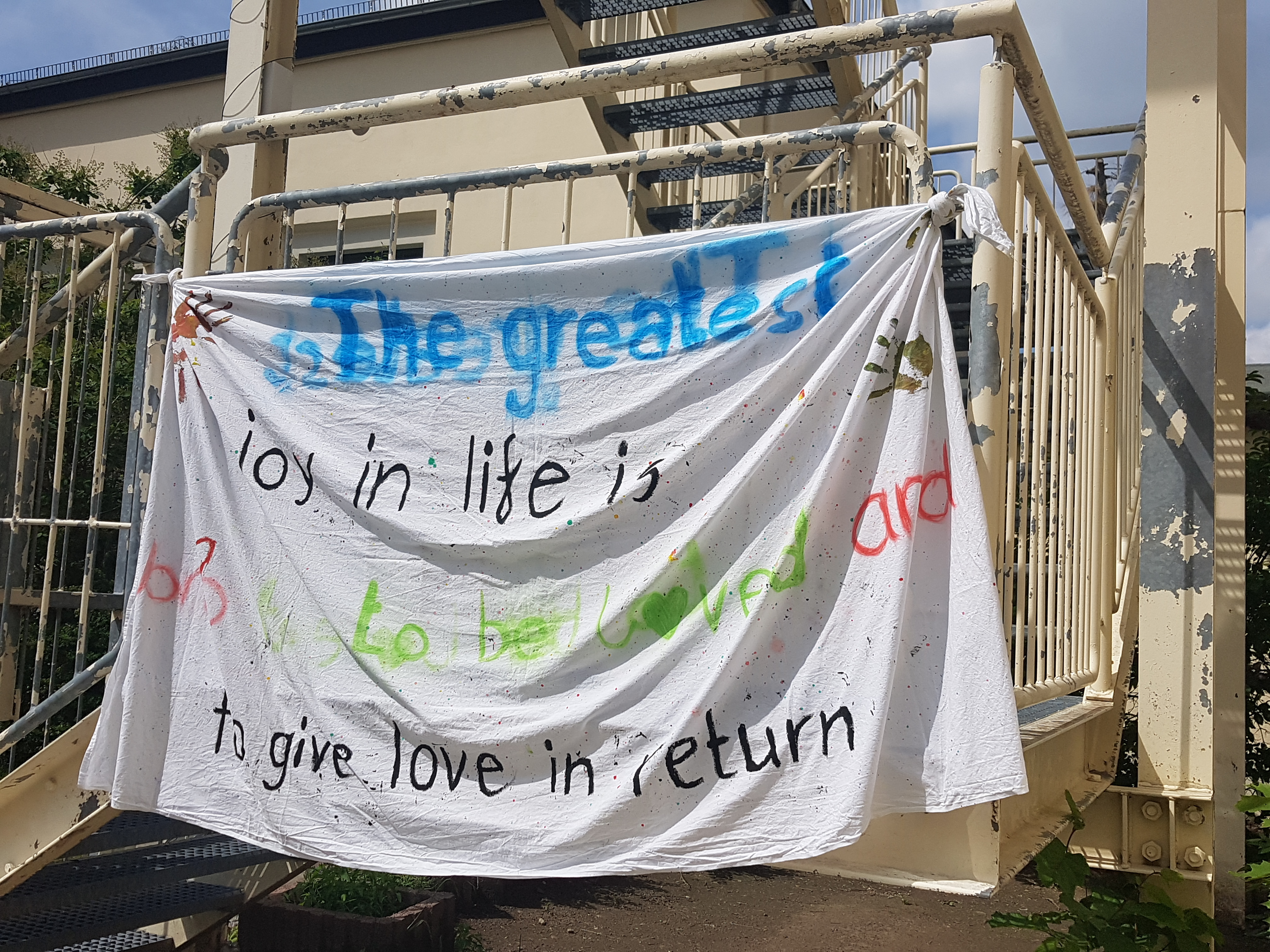 “What can we do to brighten up your day? - You‘re about to find out!” Unter diesem Leitspruch fanden eine Woche lang kleine Projekte der Klasse 9/3 statt. Das Ziel: Positivität im Alltag erfahren und für diese sensibilisiert werden. Ob beim Verteilen von Süßigkeiten im Foyer, aufmunternden Post-its oder Papierfliegern, die an Schließfächern und im ganzen Schulhaus verteilt waren, Challenges, bei welchen Komplimente gestreut oder einfach etwas Witziges gemacht werden sollte … Die Ideen waren vielfältig. Mit viel Eigeninitiative, die auf bemalten Bettlaken auf dem Hof, fröhlichen Holzschildern, Memes oder sogar auf dem eigens eingerichteten Instagram-Channel zu erkennen waren, ging eine durchaus positive Woche zu Ende. Frei nach dem Motto: Seid gespannt, macht mit und lasst euch inspirieren!